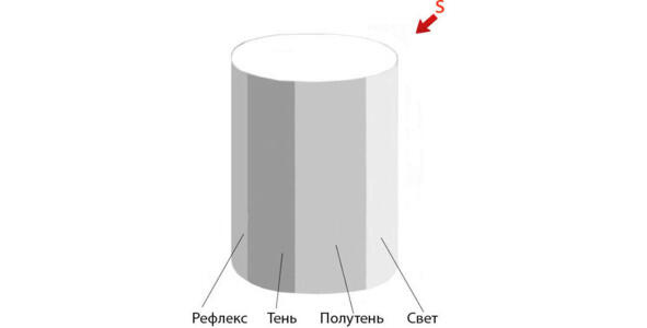 При верхнем боковом освещении распределение светотени осуществляется в последовательности: свет, полутень, тень, рефлекс. Тень падающая располагается со стороны собственной тени.