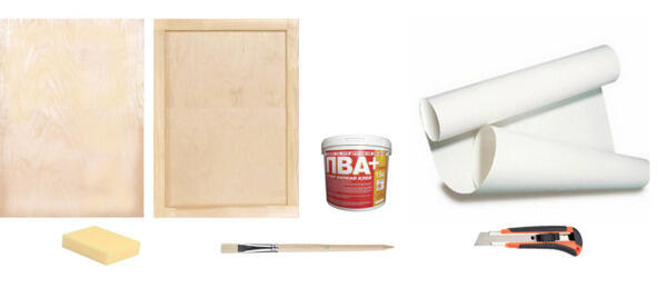 Материалы, оборудование и инструменты: планшет деревянный, бумага, канцелярский нож или ножницы, клей ПВА, широкая кисть, баночка для воды, губка.