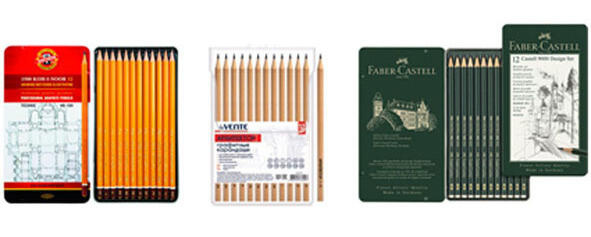 Графитовые карандаши в обычном деревянном корпусе трёхгранной, шестигранной и округлой формы знакомы каждому. Они продаются в наборах и по отдельности. Грифель в деревянной оправе классический вариант инструмента для рисования, хотя корпус может быть пластиковым или бумажным.