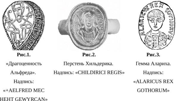 Германские короли охотно пользуются новым титулом, который в раннесредневековой историографии применяется не только для характеристики власти римских императоров, но и египетских фараонов, персидских и фракийских царей, предводителей великих варварских империй Евразии. Так, король франков Хильдерик пользовался перстнем-печаткой, на котором был изображен потрет короля в традиционном германском облачении (характерными чертами является оружие, боевой доспех, длинные волосы, разделенные пробором посередине и заплетенные в косы, шейная гривна), обрамленный надписью «CHILDIRICI REGIS». Текстуальное содержание данного перстня позволяет включить его в семиотический ряд, отражающий эволюцию коммуникативных практик от традиции устной фиксации информации к письменной (Рис.13).