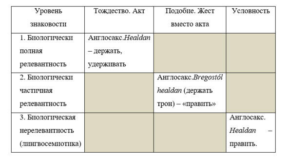 В следующей таблице демонстрируется трансформация лингвистического знака: от употребляемого в денотативном значении понятия «healdan» (держать, удерживать) к частично релевантному в биологическом отношении содержанию данного понятия в словосочетаниях «держать престол» (éþelstólas healdan), или «держать трон» (bregostól healdan), и далее к переносному значению понятия «healdan» (править), употребляемого как самостоятельно, так и в словосочетаниях «держать королевство» (healdan ríce) или «держать народ» (folc gehealdan).