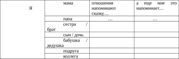 В твоей ролевой игре может реализоваться только часть сказки. Например, с матерью ты ведешь себя как Золушка с мачехой, но с сестрами чувствуешь явное превосходство возможно, как Лисичкасестричка, выгнавшая Заиньку из лубяного домика. Выбери одну линию отношений (например, я мама) и посмотри, что это напоминает, какой мотив сказки? Возможен также набор совершенно разных мотивов в зависимости от периода жизни.