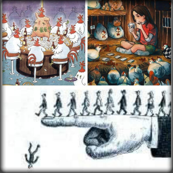 Курам же больше всех «Монополия» запонравилась Игра специальная такая, где надо было денег да побольше собирать и насобирать, собственность покупать и перекупать, страны создавать и разрушать. Покупали и перекупали, страны строили и разрушали, покупали и перекупали, страны строили и разрушали Чело-веЧки же наши по делам своим ненадолго в соседний город поулетали И вдруг Куры же все дружно И решили, что они хозяева Голубой планеты той, на которой жили наши чело-веЧки, построившие для них курятник, и в Игры разные наУчившие их играться Мораль сей скаЗки-басни такова: «Пока не увидишь Мир таким, каким он есть на самом деле не узнаешь и не поймёшь о том кто ж Ты в этом Мире на самом деле» Когда вернулись чело-веЧки наши не понравились им куры те с куриными мозгами И, чело-веЧками возомнившими себя. И решили сМодернизировать их немного: 1. Вакцинировать (чтобы ДНК их изменить). 2. Чипировать (чтобы контролировать их мысли редко иногда некуриные и прирост на планете Голубой). Но куры те были заняты совсем другой игрой своей любимой (всё законы новые писали и писали и депутатов в свой парламент куриный избирали, всё новые законы писали и писали и депутатов в свой парламент куриный избирали, пели и танцевали и в искусства разные играли, одним словом во Власть и в Чело-веЧков всё играли и играли) И даже не заметили, как их красиво и грамотно того