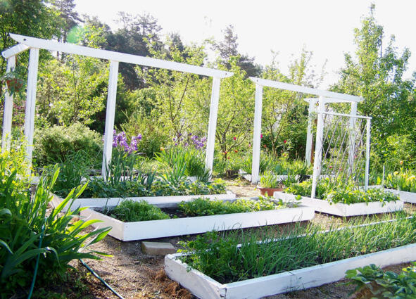 От основной части декоративного сада огород можно закрыть шпалерами с декоративными лианами или красивыми овощными культурами горохом, фасолью, живыми изгородями из красной смородины, жимолости съедобной или голубики. Земляничные гряды лучше оформить в красивые клумбы, которые можно разместить на газоне.