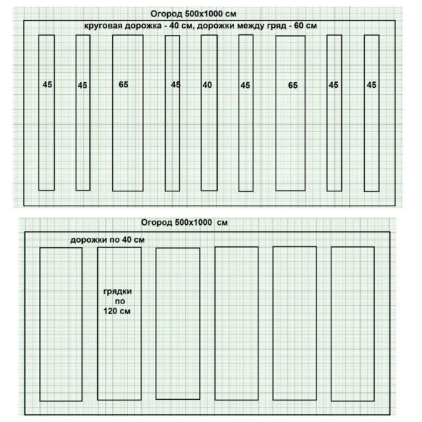 Возьмем участок под гряды размером 500х1000 см. С учетом списка овощных культур узкие гряды целесообразно делать двух размеров шириной 45 и 65 см. Таким образом на участке можно разместить 6 гряд шириной 45 см, 2 гряды шириной 65. 1 гряду шириной 40 см. Ширина дорожек между грядами 60 см. При длине 4,2 м у нас получается 18, 48 кв. м. полезной площади гряд.