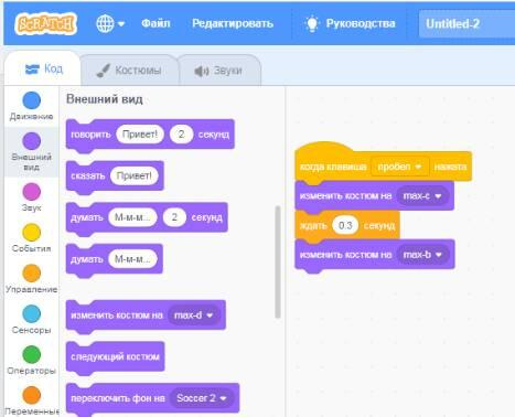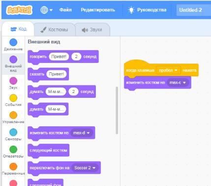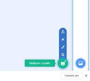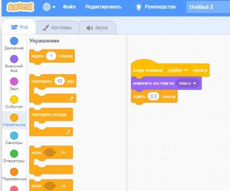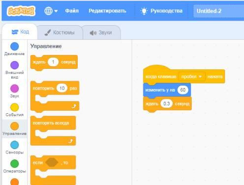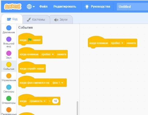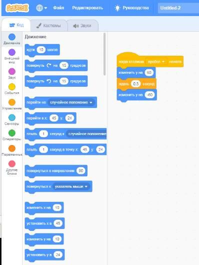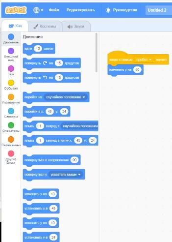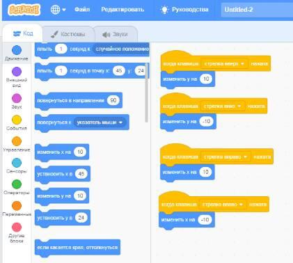 Для клавиш «Влево», «Вправо» используется «Движение» -> «Изменить х на 10». Для клавиш «Вверх», «Вниз» используется «Движение» -> «Изменить y на 10».