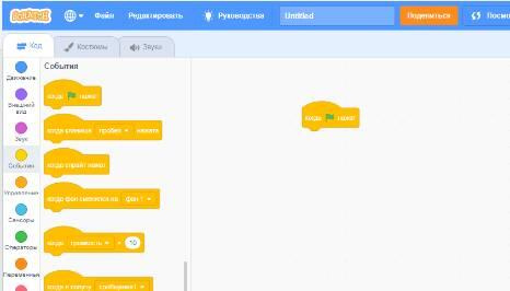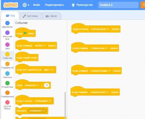 «Событие» -> «Когда клавиша нажата». Повторить 4 раза. Использовать клавиши «Влево», «Вправо», «Вверх», «Вниз».