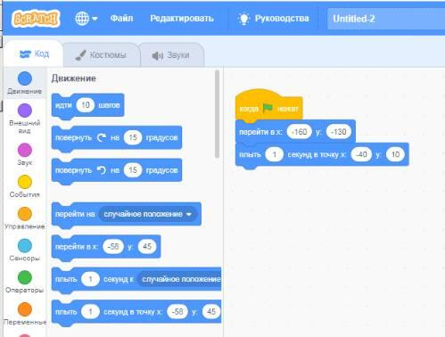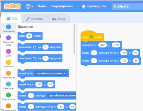 Добавь промежуточную и конечную точки. «Движение» -> «Плыть 1 секунд в точку х: у: » (поставить команду 2 раза).