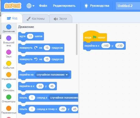 Задай начальную координату. «Движение» -> «Перейти в х: у: »