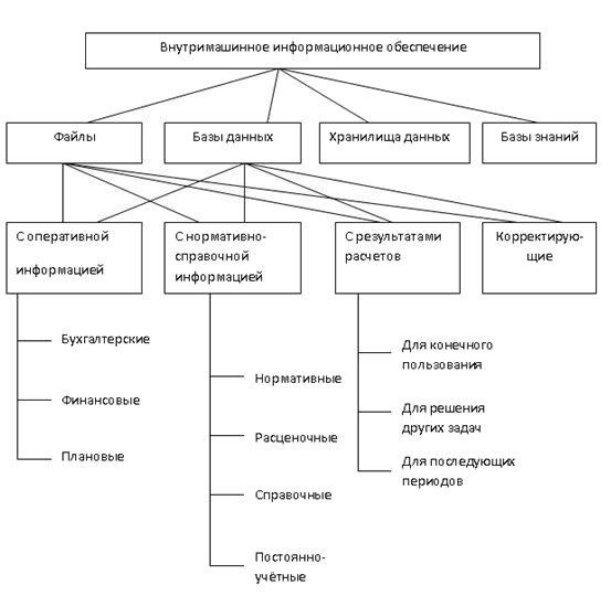Внутримашинное информационное обеспечение АРМ это ИО, которое размещается в памяти компьютера в соответствии с определённой моделью. Оно может быть организовано в форме файлов, баз данных, хранилищ данных, баз знаний, рис. 2.10.