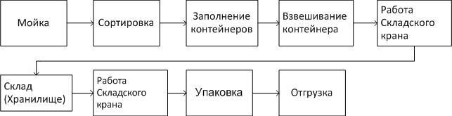 Пустой контейнер попадает в промежуточную зону, из которой он может быть отправлен в зону сортировщика для дальнейшего наполнения или на склад, в зависимости от того, сколько раз данный контейнер наполнялся и какой продукт он содержал. Например, если в контейнере содержался картофель, а текущий выполняемый заказ на лук, то контейнер отправляется на мойку.