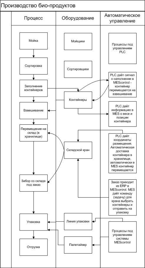 Система MEScontrol анализирует состояние склада, определяет, какие контейнеры понадобятся для выполнения заказа, и создает цепочку задач для автоматического крана. Затем MEScontrol посылает в ПЛК команду на выполнение первой задачи (координаты контейнера и номер упаковочной линии, на которую контейнер должен быть отправлен). Когда продукция из контейнера отправлена на упаковку, ПЛК информирует MEScontrol о том, что задача выполнена. MEScontrol отправляет крану следующую задачу или, если все задачи выполнены, помечает заказ как завершенный. Чтобы работала подобная автоматизированная схема взаимодействия важно правильно определить точки подключения к ТП системы класса MES. Например, на линиях упаковки точками подключения MES выступают: дозатор; контрольные весы; металлодетектор; обмотчик пленкой, контроллер линии, принтеры маркировок (мешков, пакетов, коробок, паллет), упаковщик мешков, паллетайзер, центр управления дальнейшим распределением паллет и транспортных единиц.