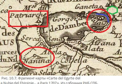 Город на острове у восточного берега озера «L de Dambee», ныне Тана. Латинское написание Palais (таким же образом, с окончанием на S прописаны названия городов Dancas, Enfas). Palais> Пал/ис Пал/ьм. На карте в красном круге остров Иерихон с городом Пальм (Palais). Протока между островом и берегом указана синей линией. В зелёном шестиугольнике «земля Галаад до самого Дана». Название города «Пальм», по моему убеждению, как уже говорил, не от слова «пальма», а от русского слова «плам/я, полым/я, с/пол/охи, пал». Город Пальм был местом поклонения огню, пламени. Город куда приходили паломники. Пал, при правомерной замене «П» на «В», Вал. Тогда это место поклонения Ваалу, Богу огнепоклонников.