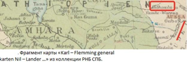 По словам Иоанна, столица его царства Ульна стоит на текущей из земного рая реке Фисон. В нашем исследовании Аваш. Или река, притоком которой была, когда то река Аваш. См. первую часть настоящего расследования. Главу «Рай и реки Рая». Река Фисон, по моему мнению, река Аваш (Hauauch). На фрагменте немецкой карты селение Нilhaulu Хилхаулу. Вероятно, здесь и была столица царя Иоанна. Корни этого слова Хил = Кил = Киль голова. В топонимии вершина, исток реки(лезг.). (М). В топонимах может произносится без мягкого знака. Второй корень Хаулу = хул = кул склон, скат (осетин.). Кула склон горы или берег реки (эвенк). (М). Берег реки.