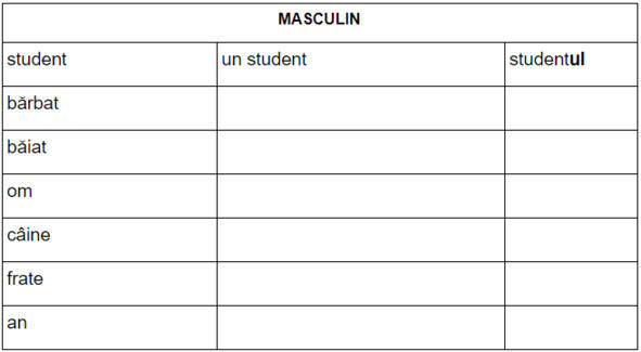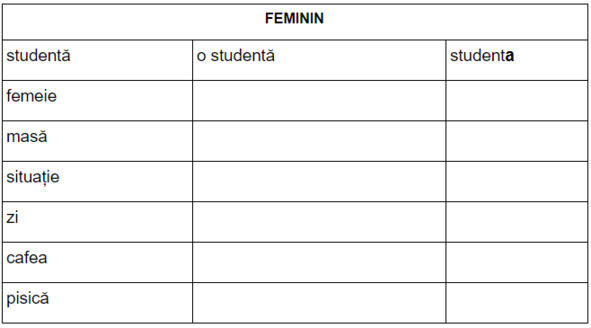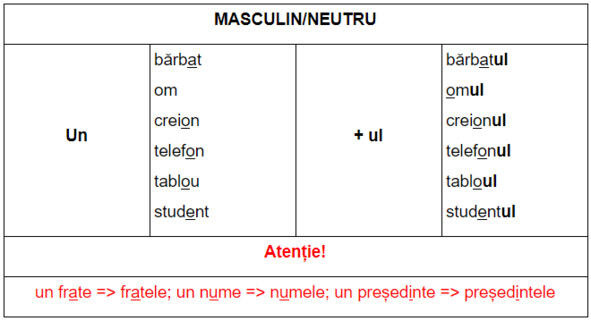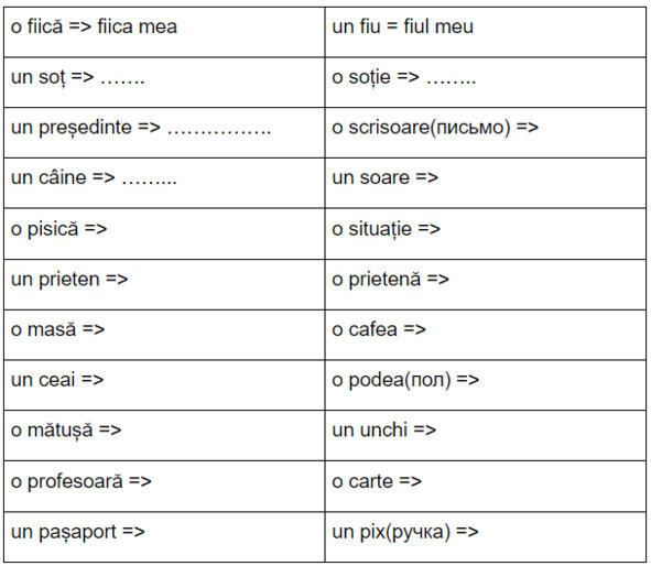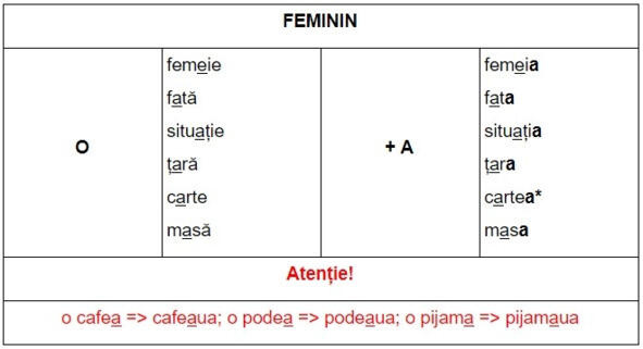 *Если в слове в женском роде перед «е» стоит согласная добавляем «а»(o carte => cartea), а если перед «е» стоит гласная меняем на «а» (o femeie => femeia).