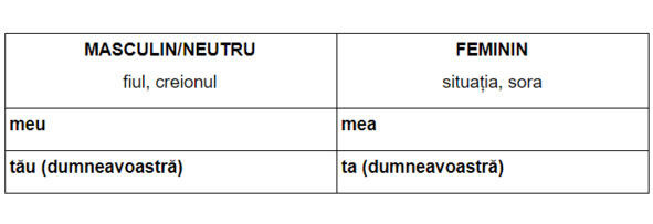 К существительные муж. и ср. рода ед. ч. применяем мой meu, твой tău, а к существительным жен. рода моя mea, твоя ta.