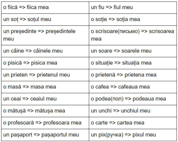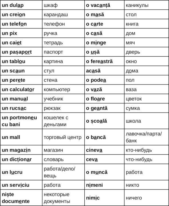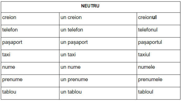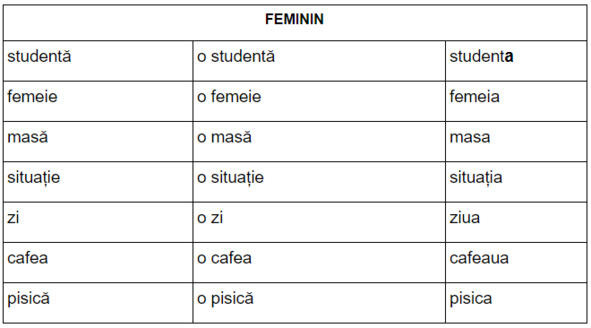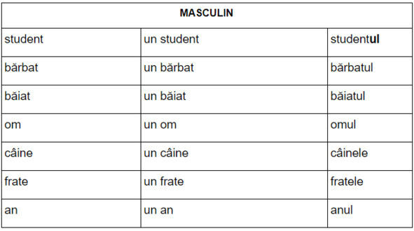 un creion, un telefon, un bărbat, o femeie, o excursie, o vacanță, o masă, un tablou, un președinte, un câine, un frate, un taxi, un oraș; o țară; o zi; o lună; o săptămână; un an; o facultate; un teatru; o piață; un magazin; o casă; un student; o greșeală, o stradă.