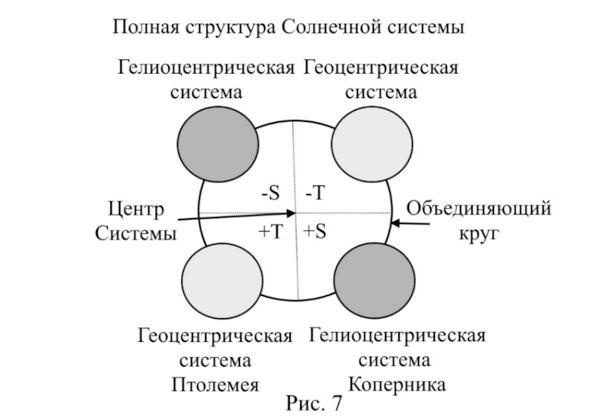 На рисунке 7 малыми кругами обозначены четыре планетарные системы с разными свойствами своих плоскостей (+S, -T, -S, +T), которые входят в полную структуру Солнечной системы. Естественно, они все должны быть чем-то объединены и составлять нечто целое. Таким объединителем их структур является большой круг, которые даёт четырьмя своими секторами каждой планетарной системе свои плоскости состояний. Всего получается четыре плоскости: