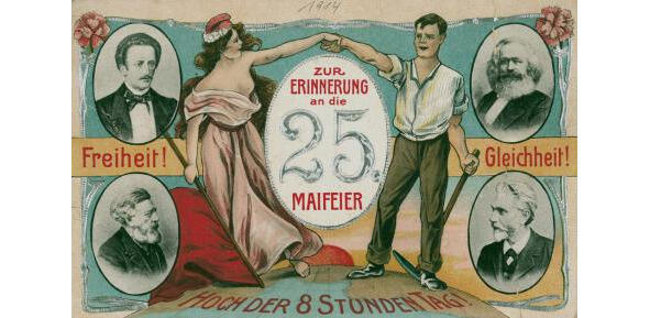 Открытка Германской Социал-Демократической Рабочей Партии 1914 года посвященная 25-ой годовщине празднования 1-го Мая. В верхнем ряду духовные авторитеты партии Фердинанд Лассаль и Карл Маркс. В нижнем ряду «вожди» партии Август Бебель и Вильгельм Либкнехт. Через несколько месяцев германская социал-демократия в большинстве своем поддержит мировую империалистическую бойню, а еще через несколько лет выступит, по собственному признанию ее деятелей в роли «кровавых собак» контрреволюции