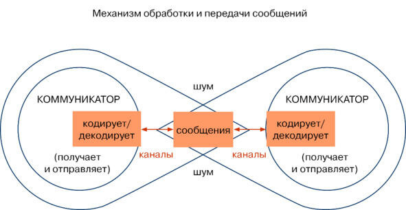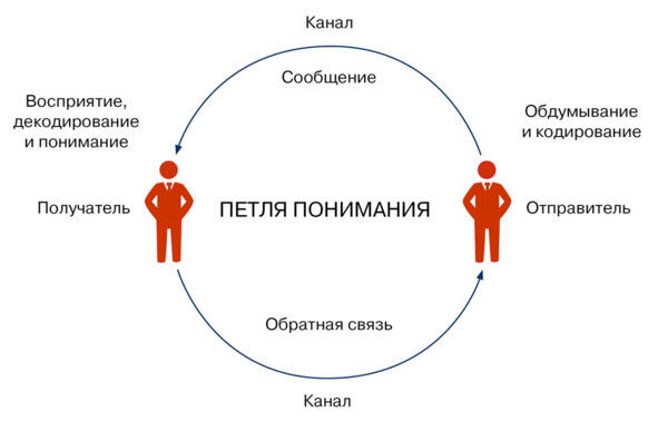Чтобы отследить, где именно в коммуникации происходит сбой, необходимо понять, как устроен механизм передачи и обработки сообщений (рис. 1). Допустим, есть два человека, один из них отправитель сообщения, другой адресат. В голове отправителя сформировались какие-то мысли, он решил поделиться ими со своим адресатом, упаковал все в слова и отправил через речевой аппарат. Другой человек через органы слуха это воспринял, распаковал слова в понятные ему смыслы и образы и сделал какие-то свои выводы. Далее выдал свое сообщение в ответ. И таким образом по этому циклу у нас происходит общение.