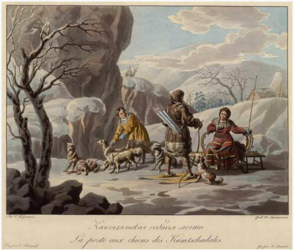 Корнеев Е. М. Ламини И. Гравюра «Народы России. Камчадальская собачья почта». 1812 г.