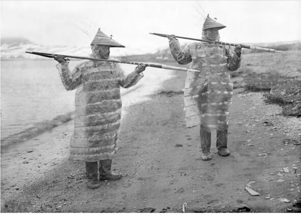 Алеуты в охотничьих костюмах, о. Умнак. Фото В. И. Иохельсона, 1910 г., МАЭ 282653