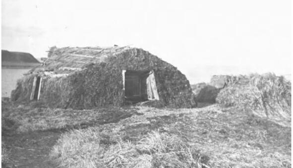 Бараборы полуподземное жилище Алеутов. Селение Никольское, Умнак. Фото В. И. Иохельсона, 1909 г.