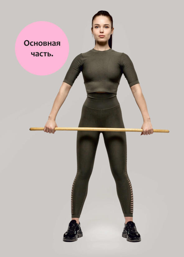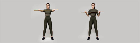 Исходное положение стоя, ноги на ширине плеч, палку держим двумя руками за спиной на уровне таза. В исходном положении вдох и на выдохе палку поднимаем по спине до лопаток и вернулись в исходное положение. Выполнить 46 раз.