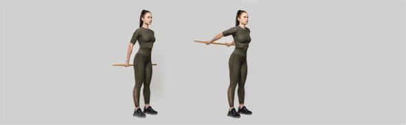 Исходное положение стоя, взяли палку широким хватом. Раскачиваем руки, выталкиваем левую руку на левую сторону вверх, подержали и отпустили. То же самое повторить на правую сторону. Дыхание произвольное. Выполнить 46 раз.