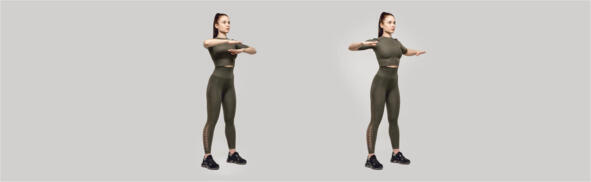 Исходное положение стоя, руки согнуты перед грудью в локтевых суставах. В исходном положении вдох, на выдохе локти отвели назад, свели лопатки, возвращаемся в исходное положение. Темп средний. Выполнить 46 раз. После выполнения упражнения расслабили руки и шею.