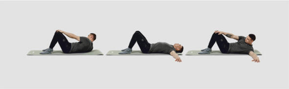 Исходное положение лежа на спине, ноги согнуты в коленных суставах, стопы на полу, руки в стороны на уровне плеч. В исходном положении вдох, на выдохе левой рукой тянемся к правому колену, вернулись в исходное положение. В исходном положении вдох, на выдохе правой рукой тянемся к левому колену, вернулись в исходное положение. Темп средний. Выполнить 4- 6 раз.