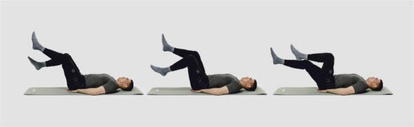 Исходное положение лежа на спине, ноги прямые вместе, руки в стороны на уровне плеч. Поднять левую согнутую в тазобедренном и коленном суставе ногу при счете на раз, на два опустить левую ногу, на три поднять правую согнутую в тазобедренном и коленном суставе ногу, на четыре опустить правую ногу. Дыхание произвольное. Темп средний. Выполнить 4- 6 раз.
