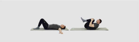 Исходное положение лежа на спине, ноги согнуты в коленных суставах, стопы на полу на ширине плеч, руки в стороны на уровне плеч. В исходном положении вдох, на выдохе поднять согнутые в коленных суставах ноги и обхватить руками голени, приподнять голову, и подбородком потянуться к коленям, затем вернуться в исходное положение. Темп средний. Выполнить 4 6 раз.
