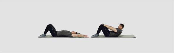 Исходное положение лежа на спине, ноги согнуты в коленных суставах, стопы на полу на ширине плеч, руки вдоль туловища. Руки подняли вверх вдох, на выдохе двумя руками потянулись к коленям, голову и плечи приподняли. Темп средний. Выполнить 4 6 раз.
