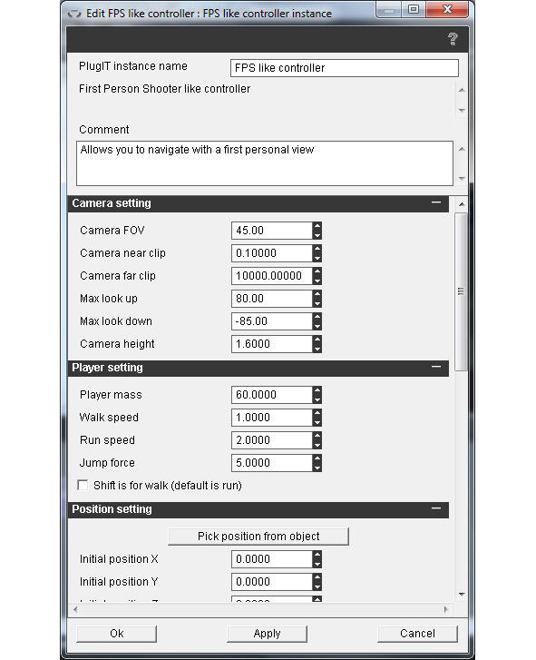Щелкнув два раза на компоненте FPS like controller, можно установить его свойства, такие как угол камеры, скорость передвижения и др.