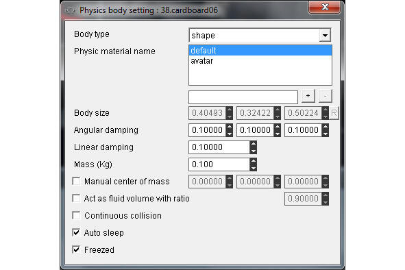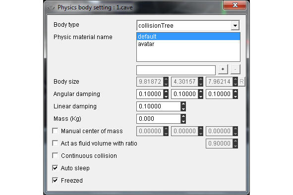 Чтобы придать реальность объекту, в его свойствах выберем Set physic, выберем объекту форму shape и установим его массу, при этом в узле cave сцены должна быть установлена форма collisionTree. Если отмечен флажок Freezed, тогда физика объекта будет ожидать столкновения, перед тем как заработать.