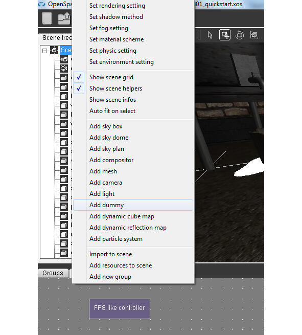 Чтобы объединить объекты в группу, на узле Scene нажмем правой кнопкой мышки и выберем Add dummy, затем в дереве сцены перетащим объекты в созданный узел dummy.