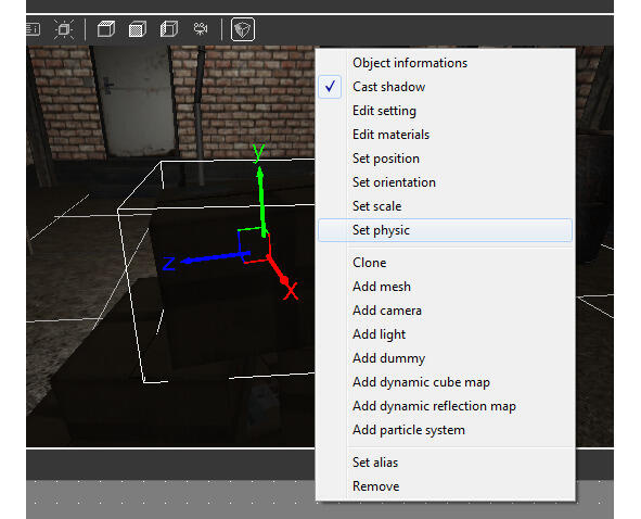 Выберем узел cave сцены, нажмем правой кнопкой мышки и выберем Set physic.