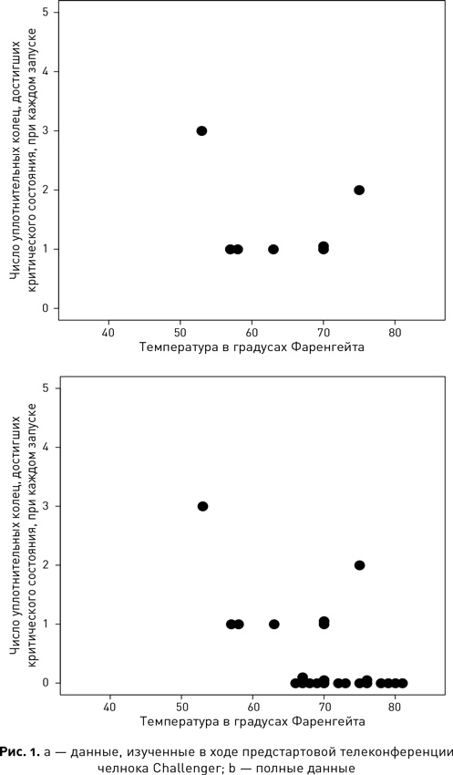 Однако если мы добавим отсутствующие данные по запускам, при которых не наблюдалось критических состояний уплотнительных колец, то получим совсем иную картину, изображенную на рис. 1, b. И закономерность становится очевидной. Фактически все запуски, которые произошли при температуре ниже 65 ºF, приводили к критическому состоянию уплотнительных колец, и лишь 4 из 21 запуска, осуществленных при более высоких температурах, дали подобный результат. На диаграмме четко видна закономерность чем ниже температура, тем выше риск. И что еще хуже, прогнозируемая температура была намного ниже минимальной, при которой ранее проводились запуски (DD-тип 15: экстраполяция за пределы ваших данных).