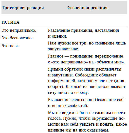 Три следующих главы посвящены триггерам истины. Они создаются нашими когнитивными и эмоциональными реакциями на обратную связь, которая кажется ошибочной или несправедливой. Когда срабатывает триггер, понимать ее становится трудно. Трудно понять, какого типа обратную связь мы получаем (глава 2), что имел в виду собеседник (глава 3) и каково наше состояние (глава 4).
