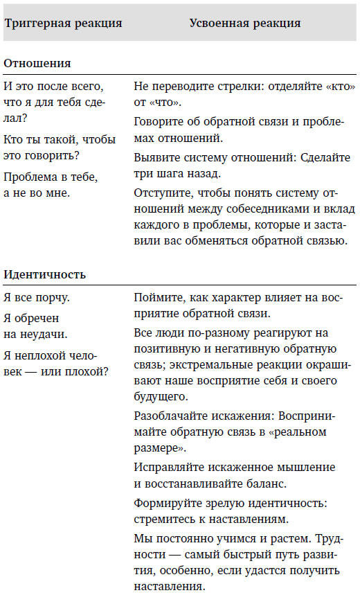 * * *В главах 29 мы подробно обсудим все наши триггеры, их влияние и основные стратегии более эффективного их использования. В главах 1011 мы вернемся к вопросу о том, когда следует отклонять обратную связь и как вести разговоры об обратной связи. В главе 12 вы найдете полезные советы по проверке обратной связи и использованию ее для развития.