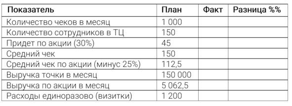 Рассчитываем прогноз выручки по акции, в конце месяца считаем факт. В примере ставим свои цифры.