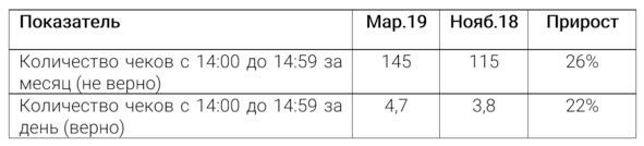 Сравниваем количество чеков с 14:00 до 14:59 за март 2019 с мартом 2018 года или с октябрем 2018 года, если в марте не работали.