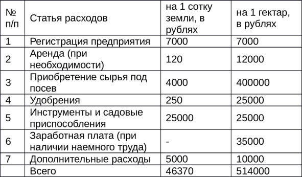 Каковы будут примерные затраты на старте, в зависимости от размеров угодий, видно из таблицы.