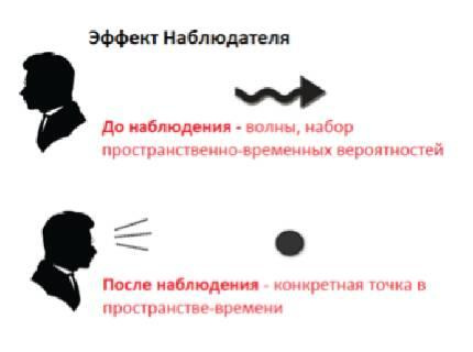 Мы говорили об опытах с прохождением электронов через щель образуется дифракционная картина. Даже если пропускать электроны по одному неизвестно, в какой точке электрон окажется после прохождения через щель. Но если в процесс включатся НАБЛЮДАТЕЛЬ, электрон ведет себя как частица. Траекторию которой можно рассчитать.