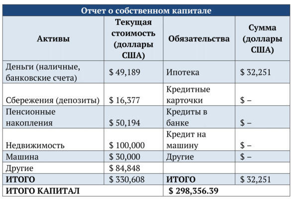 Если вы не знаете, где вы находитесь, вы не знаете, куда идти. Так же и в финансах необходимо выписать в таблицу все, чем вы владеете в данный момент времени, и все, что вы кому-либо должны. Эта таблица и будет вашим отчетом о собственном капитале, в котором с одной стороны будут ваши активы с их текущей стоимостью, с другой ваши обязательства (долги, кредиты все, что вы должны другим). Заполните таблицу и просуммируйте все ваши активы и обязательства. В качестве примера ниже приведен отчет о собственном капитале мисс Люси. Таблицу можно взять за основу. У вас должно получиться что-то похожее.