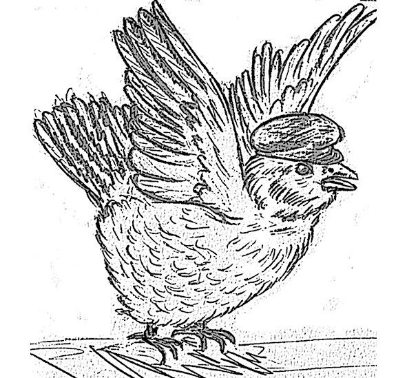 В этот миг к нам подлетела какая-то мелкая птаха. Воробей, что ли. Не разбираюсь в них. На голове у этого существа возвышалась лихо заломленная на правый бок малиновая кепка. Не такая, как у Хуа. Какая-то более высокая. Кажется, картузом называется. Кроме этого головного убора ничто не выдавало его принадлежности к мыслящим созданиям. Даже речь его показалась мне бессвязным щебетанием.