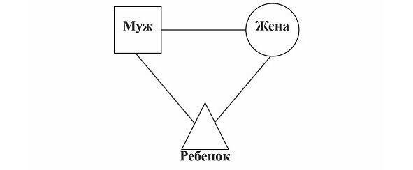 Если мы посмотрим на схему семьи (рис.5), то увидим, что «линии взаимоотношений» соединяют между собой только двух людей. Это означает, что нет отношения «родители ребенок», а есть отношения «мама ребенок» и «папа ребенок».