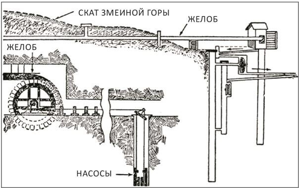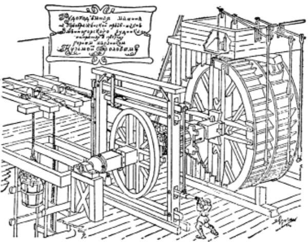Вода приводила в действие колёса, рычаги, шестерёнки, поршни насосов всё скрипело, ползло, стучало, работало само! Нельзя сказать, что участие человека было больше не нужно. Но человек скорее следил за механизмами, чтобы прийти к ним на помощь, если что-то пойдёт не так. Он уже не тащил всю тяжесть горы на своих плечах.