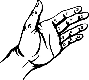 а, б суставы большого пальца. в, г, д суставы указательного пальца. е, ж, з суставы среднего пальца. и, к, л суставы безымянного пальца.
